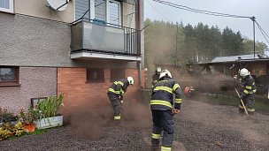 Osm jednotek hasičů vynášelo ze sklepa bytového domu v obci Vítězná žhnoucí uhlí