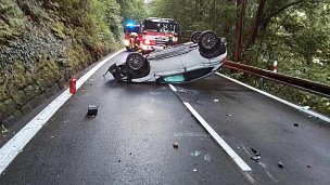 Osobní vozidlo se po nehodě v Hřensku převrátilo na střechu, poškozena byla i opěrná zeď u silnice