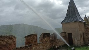 Požár Mariánské věže státního hradu Karlštejn prověřil hasiče, cvičilo 15 jednotek