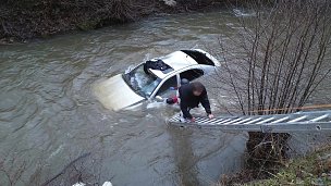 U Lažánek řidič sjel autem do řeky, pak prchal před vodou na střechu