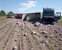 Nákladní vozidlo s nákladem kamene sjelo v Milovicích u Hořic ze silnice a na poli se převrátilo. Zraněný řidič skončil v péči záchranářů. Hasiči zabezpečují vozidlo proti požáru, jímají a přečerpávají unikající naftu.