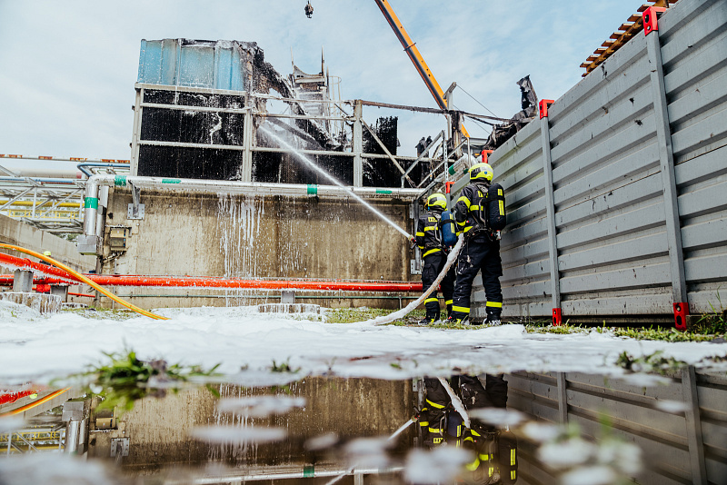 Hasiči po příjezdu na místo události nasadili k likvidaci požáru tři vodní proudy s těžkou i střední pěnou, zasahovali v dýchací technice – chlazení sousední věže zajistilo stabilní hasicí zařízení, které bylo součástí technologie.