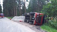 Nákladní auto havarovalo ve čtvrtek odpoledne na silnici z Krajkové směrem na Liboc. Auto se převrátilo na bok a vysypal se převážený náklad. Hasiči na místě zajistili únik provozních kapalin, preventivně chránili i nedaleký vodní tok. Při vyprošťování vozidla byl provoz v místě nehody omezený.