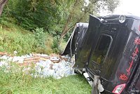 Převrácený kamion plný balené vody poblíž Karlových Varů značně komplikoval dopravu na silnici I/6