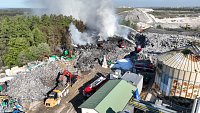 Požár skládky plastů v Rynholci na Rakovnicku je uhašený. Hasiči dál prolévají požářiště pomocí monitorů a přeskládávají zbytky materiálu pomocí pásových rypadel a buldozeru. Poplachový stupeň byl snížený na třetí. Část z jednotek už z místa zásahu odjelo, zůstává asi stovka hasičů.