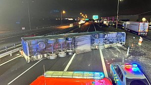 Převrácený kamion přes tři pruhy zablokoval příjezd do Prahy po D1