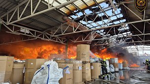 Hasiči zasahují u velkého požáru skladu v Otrokovicích