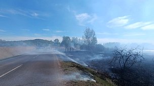 Ve Skřinářově zasahují hasič u rozsáhlého požáru travního porostu a mladých stromků