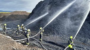 Patnáct jednotek požární ochrany zasahuje na skládce v Růžodolu u Litvínova u požáru hromady štěpky o půdorysu přibližně 20 × 50 metrů. Hasiči prolévají hromadu vodou.
