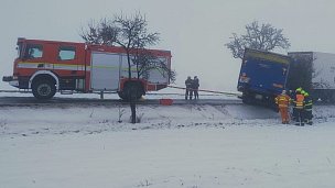 Na zledovatělé komunikaci u Panenského Třnce havaroval kamion, nákladní a osobní automobil