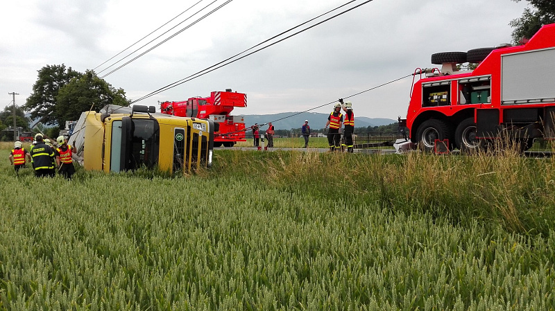 Hasiči vyprošťovali v Třinci maďarský kamion s televizemi, skončil na boku v příkopu