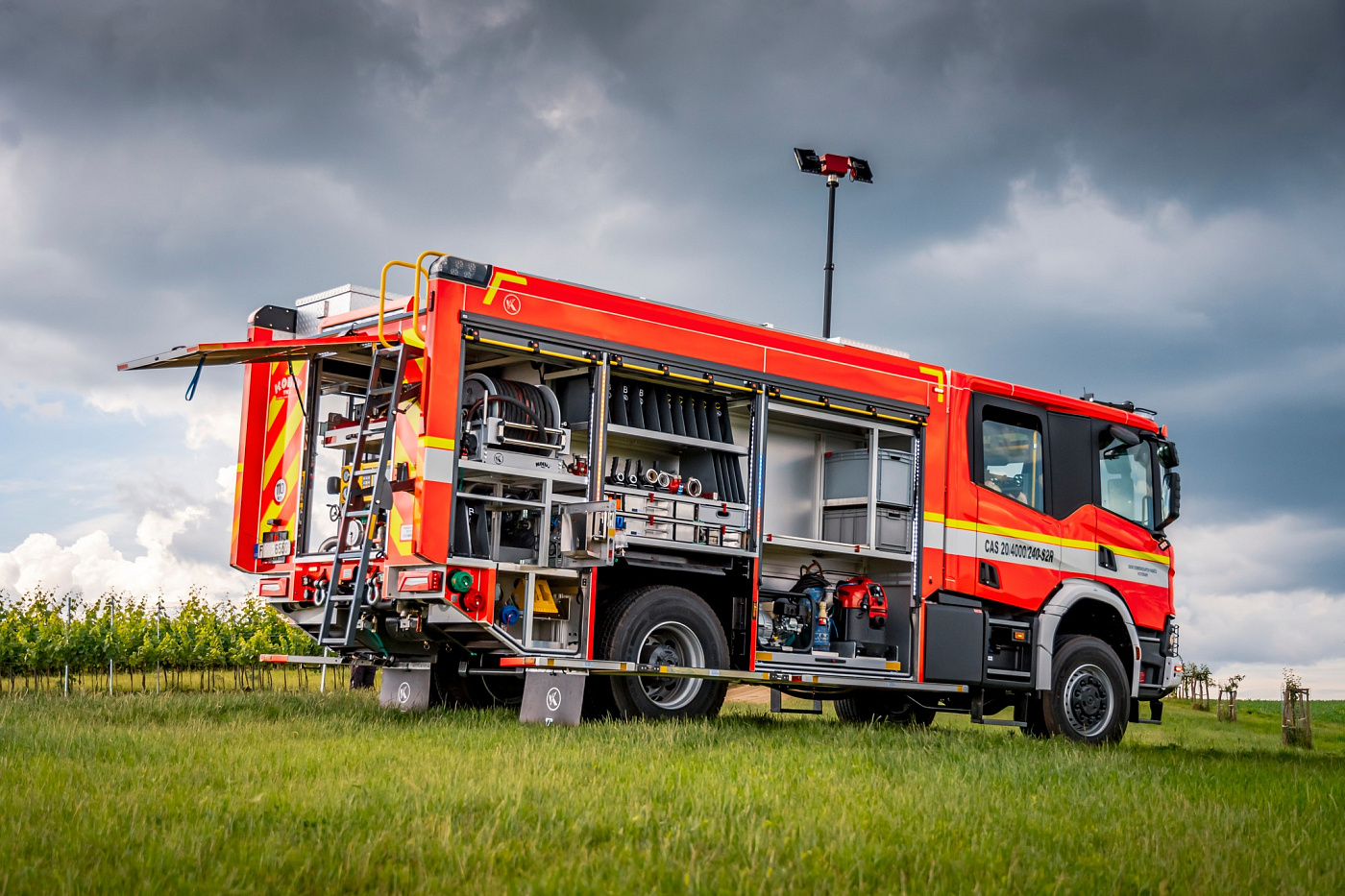 Na obou bocích jsou pohledové LED stavoznaky, signalizují množství vody i pěnidla – vody veze Scania v nádrži z nerezavějící oceli 4000 litrů, pěnidla pak 240 litrů.
