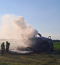 Požár řezačky v plném rozsahu na poli v katastru obce Oseček zlikvidovali profesionální hasiči z Kolína a Poděbrad ve spolupráci s dobrovolnou jednotkou Sokoleč pomocí tří vysokotlakých vodních proudů.