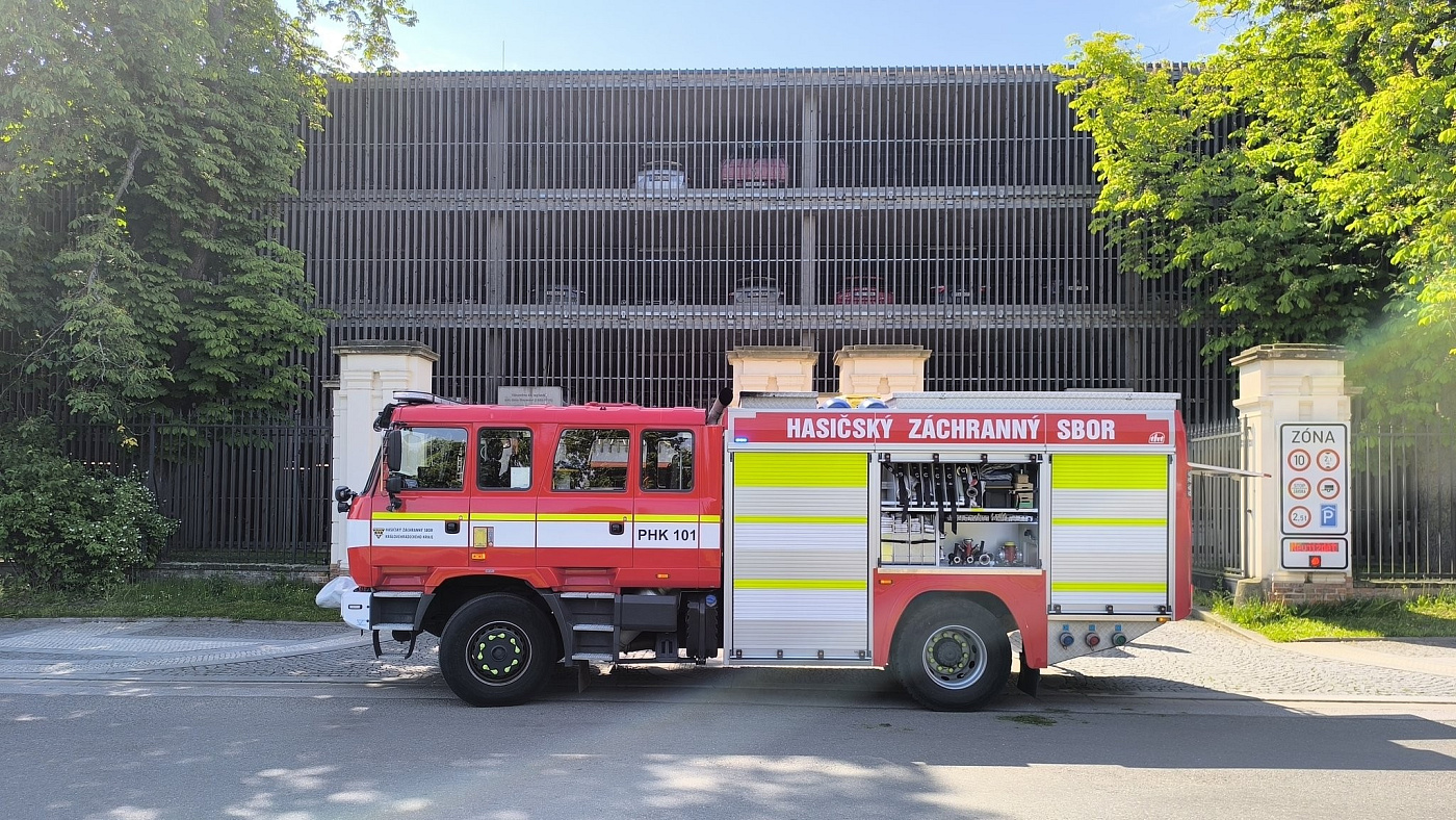 V Hradci Králové v parkovacím domě Jana Gayera probíhá v tuto chvíli cvičení jednotek HZS Královehradeckého kraje.