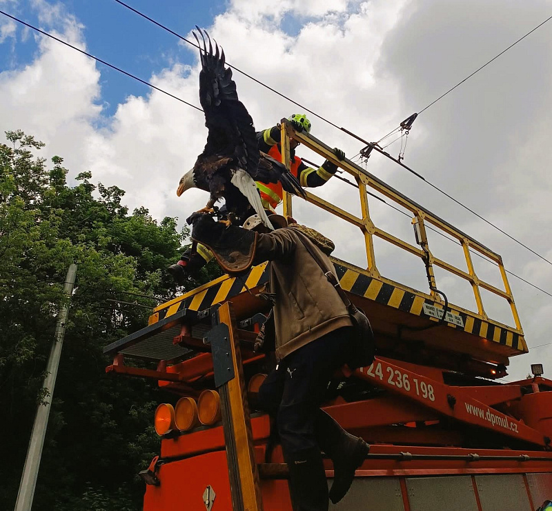 V Ústí nad Labem se orel zamotal do trolejí, hasiči pro něj zajeli s plošinou