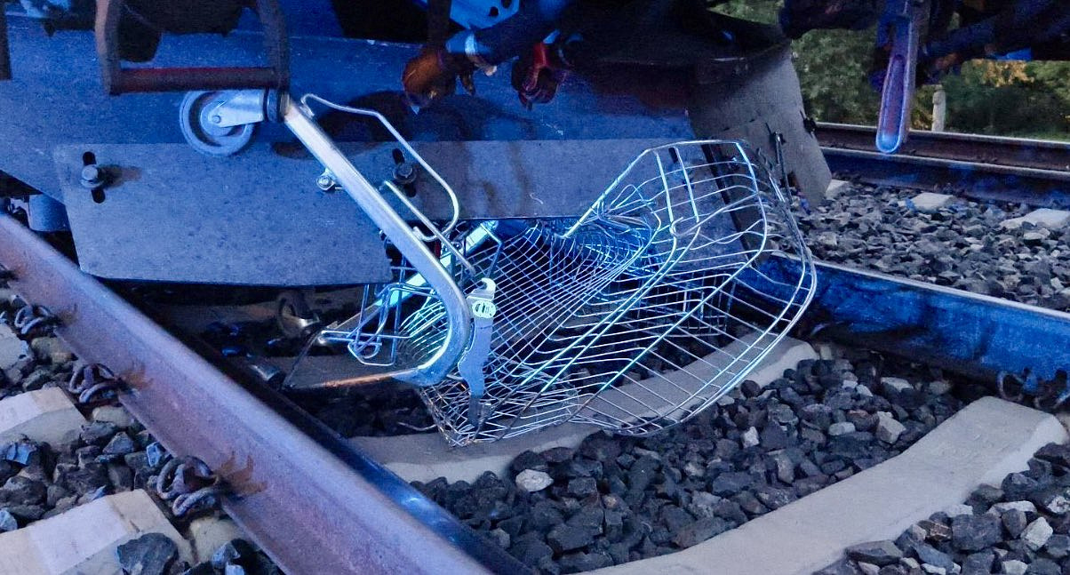 Brzy ráno najel nákladní vlak do nákupního vozíku, který někdo nechal v kolejišti v Litoměřicích. Nákupní košík museli z přední části podvozku lokomotivy odstranit hasiči Správy železnic. Provoz byl ve stanici omezen na dvě hodiny.