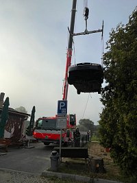 V Praze Radotíně profesionální hasiči ze stanic Radotín a Strašnice vyzvedávali pomocí automobilového jeřábu osobní vozidlo, které sjelo do řeky.