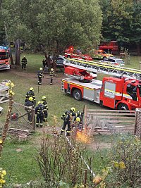 Operační důstojník k místu události vyslal jednotky z druhého stupně požárního poplachu. Dvě osoby skončily v péči zdravotnické záchranné služby. Zásah probíhá v dýchací technice s využitím výškové techniky.