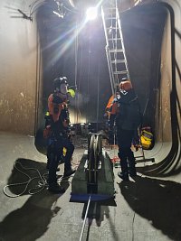Hasiči po příjezdu na místo zjistili, že dělníci se nacházejí v tzv. úklonové části téměř vertikálního tubusu a ve tmě a zimě se s vypětím sil snaží držet konstrukce převráceného montážního vozíku. Po třech hodinách se podařilo vyprostit dva podchlazené dělníky, zbylí dva se dočkali záchrany po další hodině. Dramatický a neuvěřitelně psychicky i fyzicky náročný zásah komplikovalo několik faktorů: tma, vlhko, hloubka, konstrukce tubusu, čas a špatné spojení, které ztížilo komunikaci při velení.