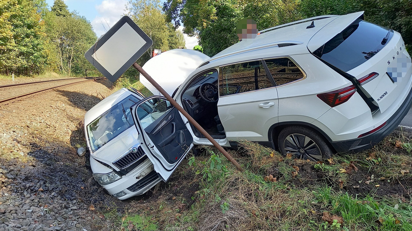 Dvě osobní vozidla se střetla v katastru obce Hronov, z důvodu nehody byl omezen provoz i na železnici