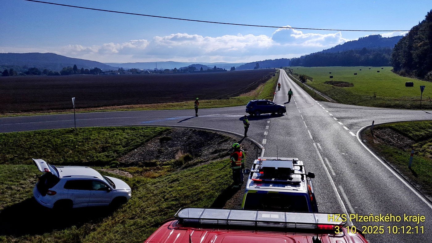 V lokalitě Pod Kotlem u Rokycan se srazila dvě osobní auta. Nehoda je se zraněním jedné osoby. Jedno vozidlo skončilo mimo komunikaci. Přivolaní hasiči provedli protipožární opatření.