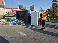 Z nákladného vozidla se vysypal přepravovaný materiál. Hasiči provedli zajištění místa nehody, protipožární opatření a po zadokumentování nehody Policií ČR bylo provedeno převrácení vozidla zpět na kola. Následoval úklid komunikace a její zprůjezdnění. Nehoda se obešla bez zranění.