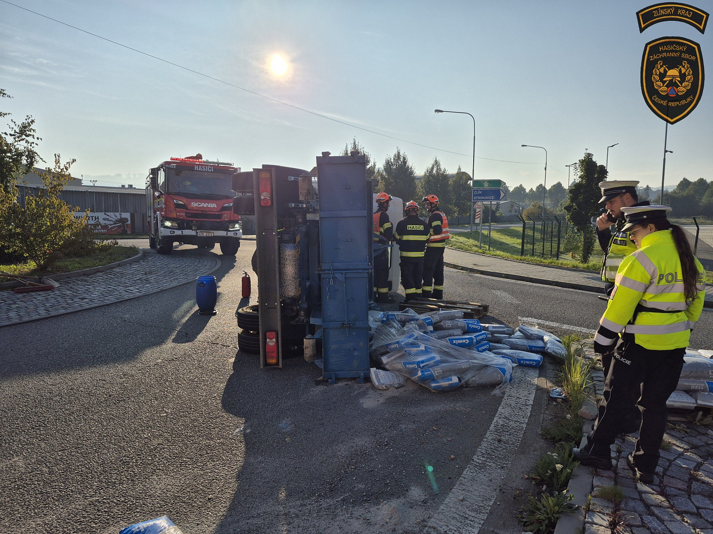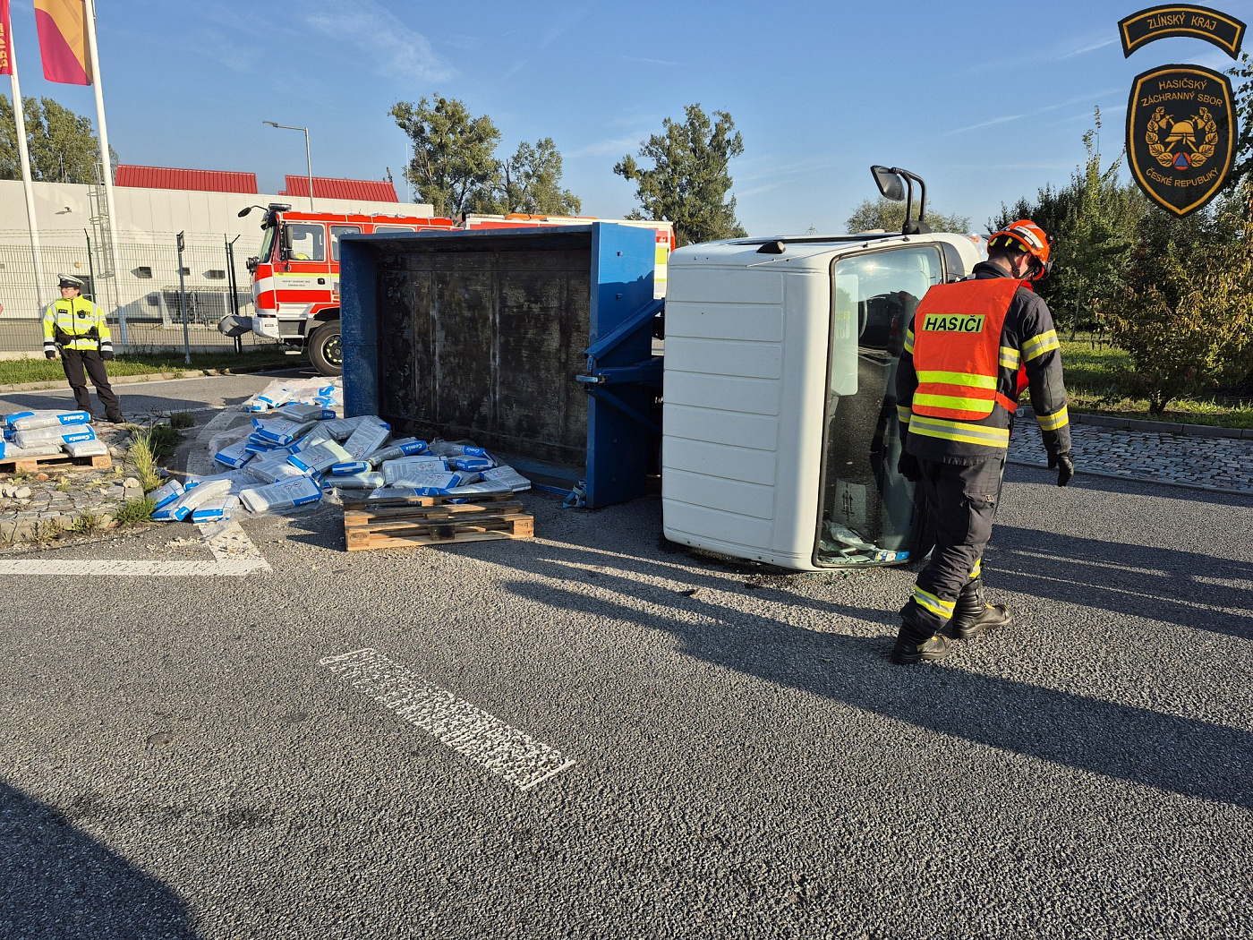 Ve Zlínské části Malenovice v Tačovské ulici zasahují profesionální hasiči ze stanic Otrokovice a Zlín u dopravní nehody nákladného vozidla, které se převrátilo na kruhovém objezdu.