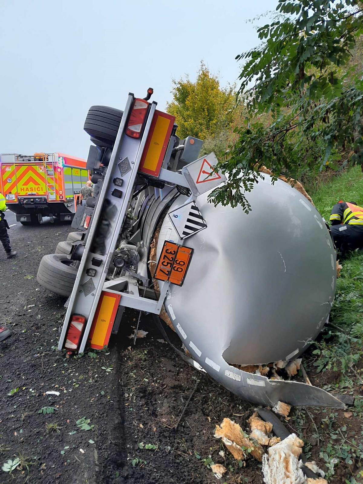 Převrácená cisterna s asfaltem zaměstnala před sedmnáctou hodnou v Mostě čtyři jednotky hasičů