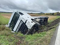 Na silnici č. 35 havaroval u Újezdu p. Troskami nákladní vůz naložený uhlím. Auto skončilo na boku, náklad se vysypal mimo komunikaci. Hasiči místo zajistili, zkontrolovali, zda nedochází k úniku provozních kapalin a předali místo PČR. Překládku uhlí a vyproštění zajistí firma.