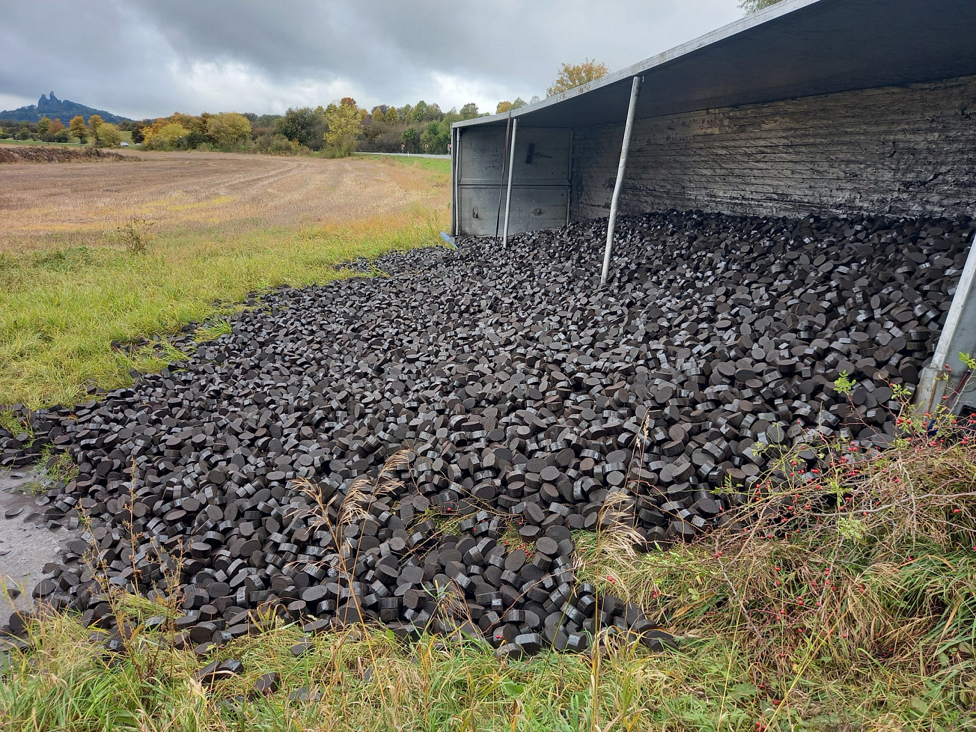 Na silnici č. 35 havaroval u Újezdu p. Troskami nákladní vůz naložený uhlím. Auto skončilo na boku, náklad se vysypal mimo komunikaci. Hasiči místo zajistili, zkontrolovali, zda nedochází k úniku provozních kapalin a předali místo PČR. Překládku uhlí a vyproštění zajistí firma.