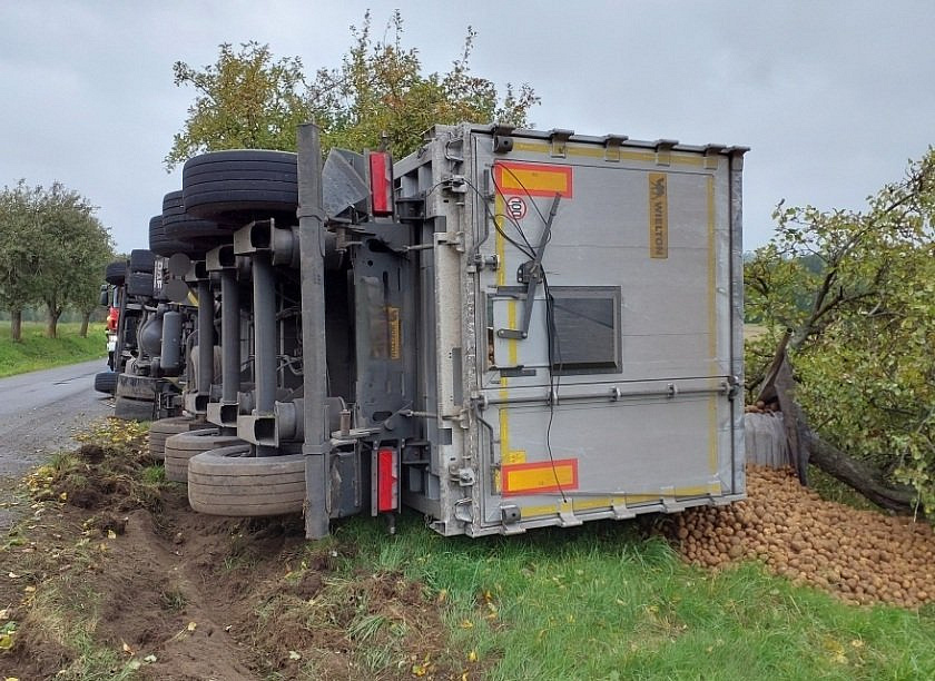 V obci Ranná se převrátil do příkopu kamion přepravující brambory