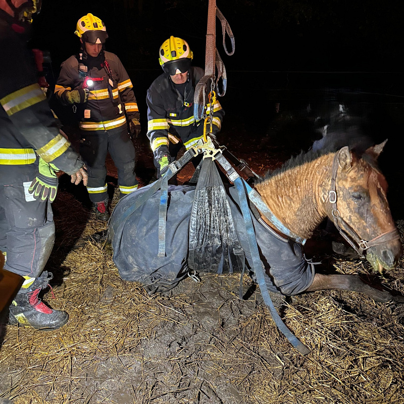 Na místo události v Březinách, místní části Děčína, vyjely dvě jednotky požární ochrany. Hasičům se pomocí automobilového jeřábu podařilo postavit koně na nohy a po ošetření veterinářku ho odvedli zpět do stáje.