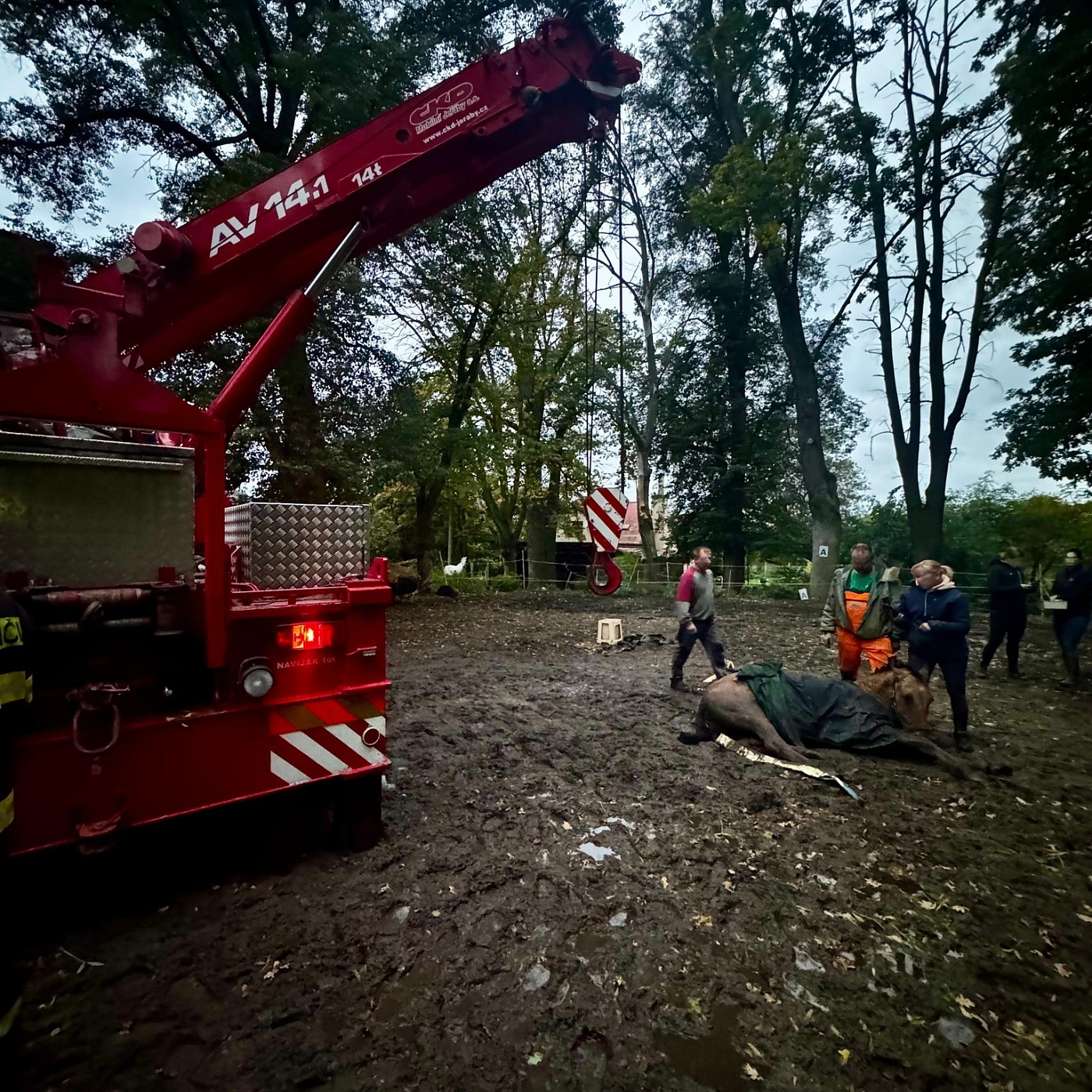 Hasiči v Děčíně pomocí jeřábu zvedali ze země koně, který se sám nemohl postavit