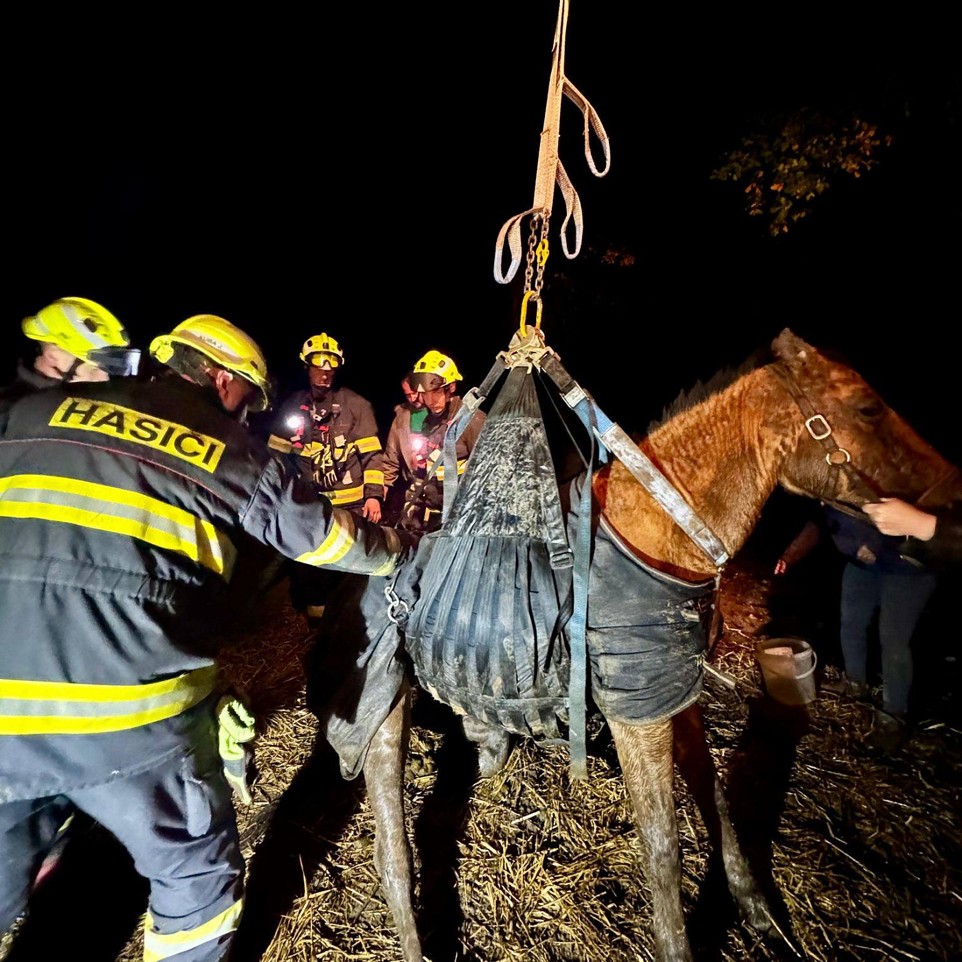 Na místo události v Březinách, místní části Děčína, vyjely dvě jednotky požární ochrany. Hasičům se pomocí automobilového jeřábu podařilo postavit koně na nohy a po ošetření veterinářku ho odvedli zpět do stáje.