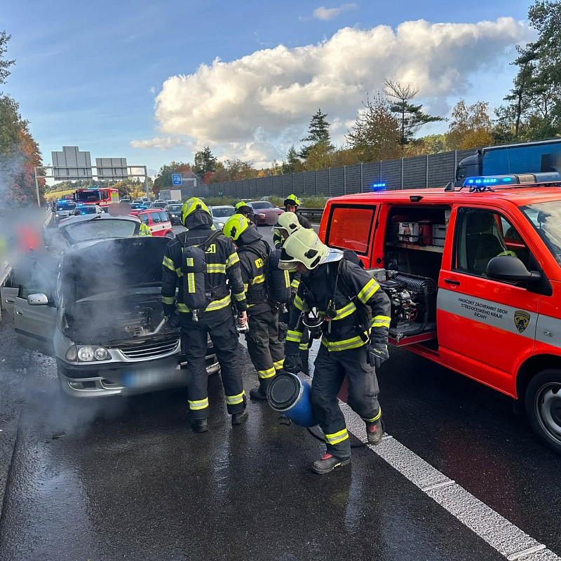 K požáru osobního automobilu vyjeli pár minut po půl páté profesionální hasiči ze stanice Říčany společně s dobrovolnými hasiči ze Senohrab na 19. kilometr dálnice D1.