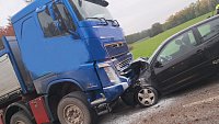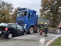 Ke střetu osobního a nákladního auta došlo na silnici II/325 u Velkého Vřešťova. Jedna osoba byla zraněna. Osobní vůz skončil po nárazu zaklíněný přední částí pod náklaďákem, posádku nebylo nutné vyprošťovat.