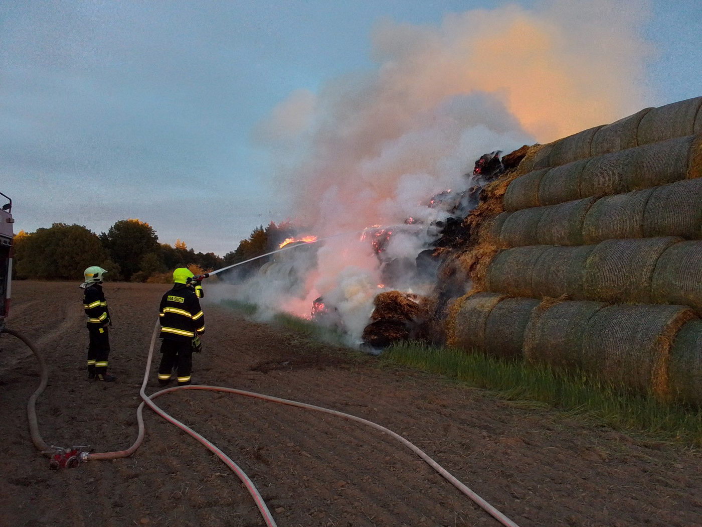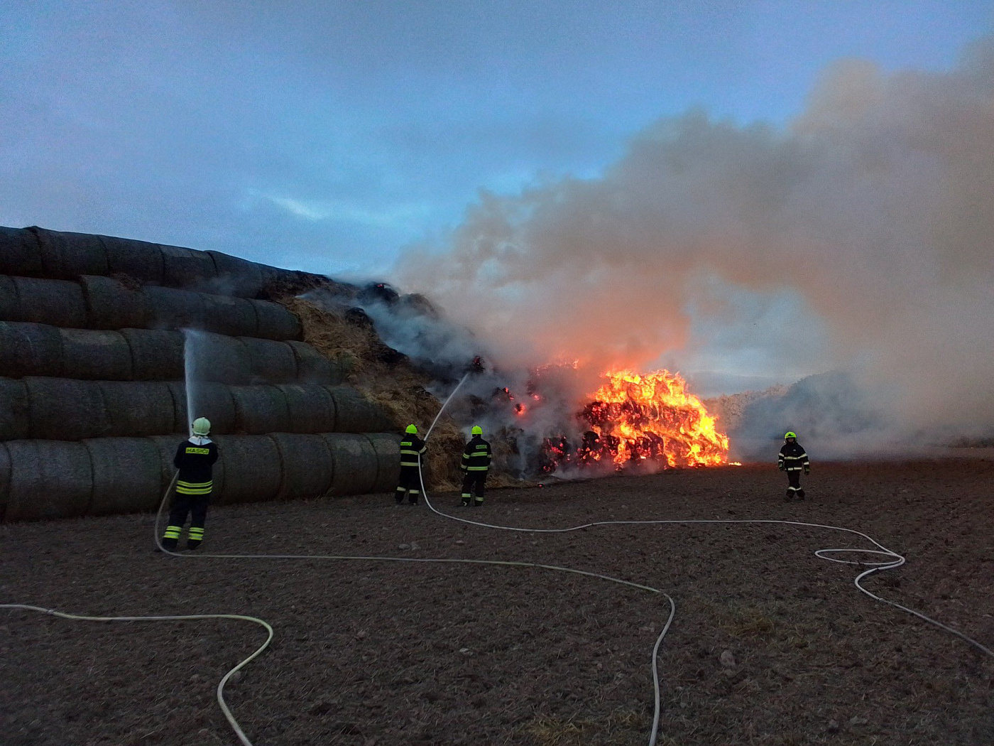 Pět jednotek profesionálních i dobrovolných hasičů aktuálně zasahuje u požáru přibližně 50 balíků sena poblíž obce Žďárek na Karlovarsku. Hasiči provádějí hasební práce a brání dalšímu šíření požáru.