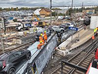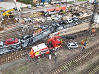 V Kolíně vykolejily nákladní vagóny, drážní hasiči musí z poškozeného vlaku odstranit osobní auta