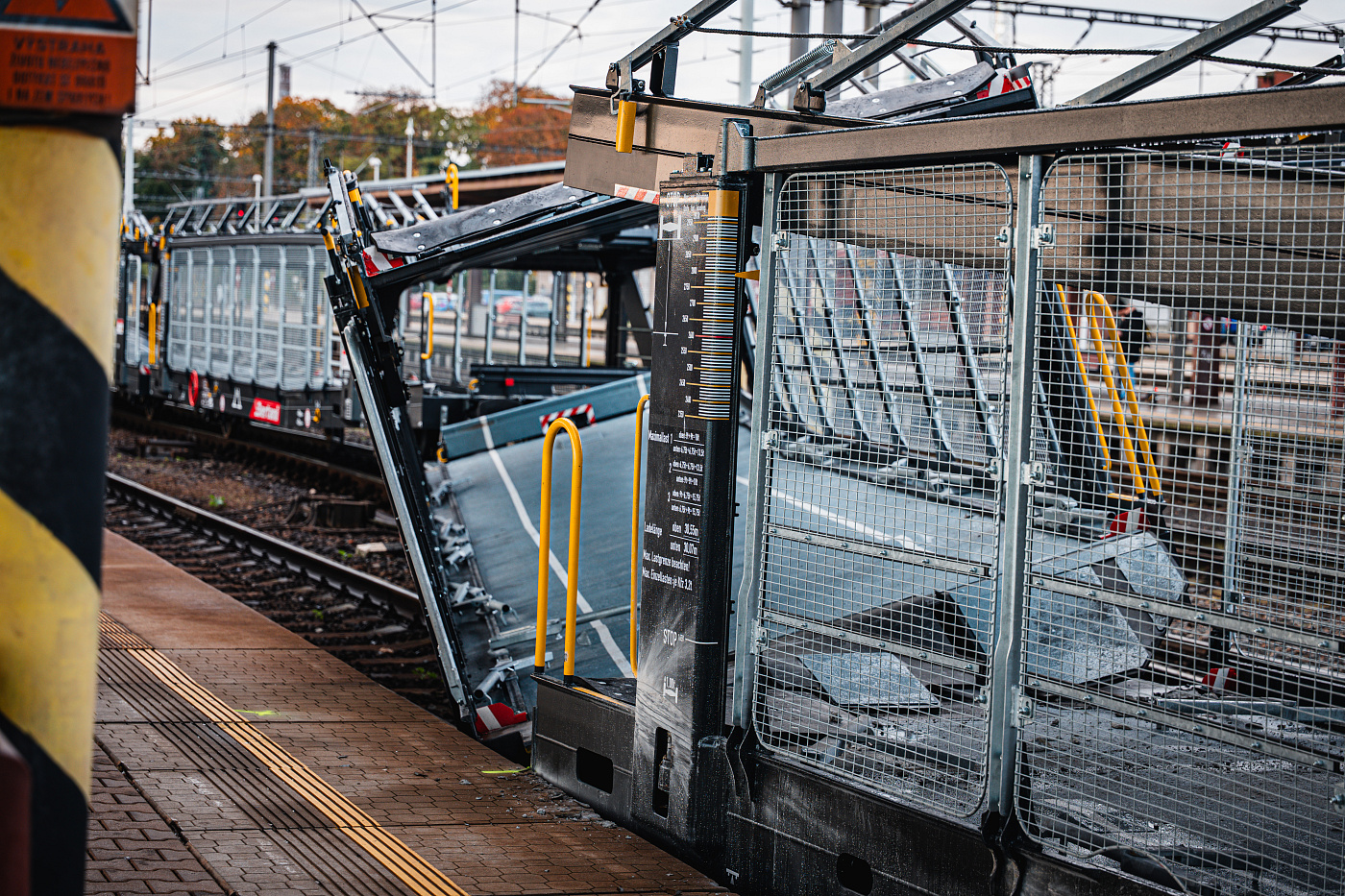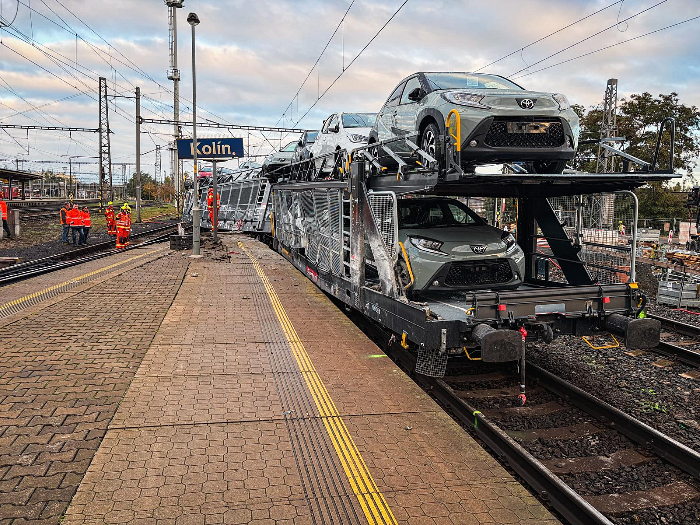 V Kolíně vykolejily nákladní vagóny, drážní hasiči musí z poškozeného vlaku odstranit osobní auta