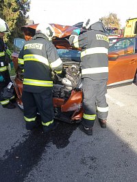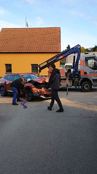 Náraz osobního auta do domu řešily na Včelné profesionální hasiči ze stanice České Budějovice a Suché Vrbné. Z elektrovozidla pomohli řidičce svědci nehody. Hasiči odpojili baterii a termokamerou prověřili, že se neohřívá.