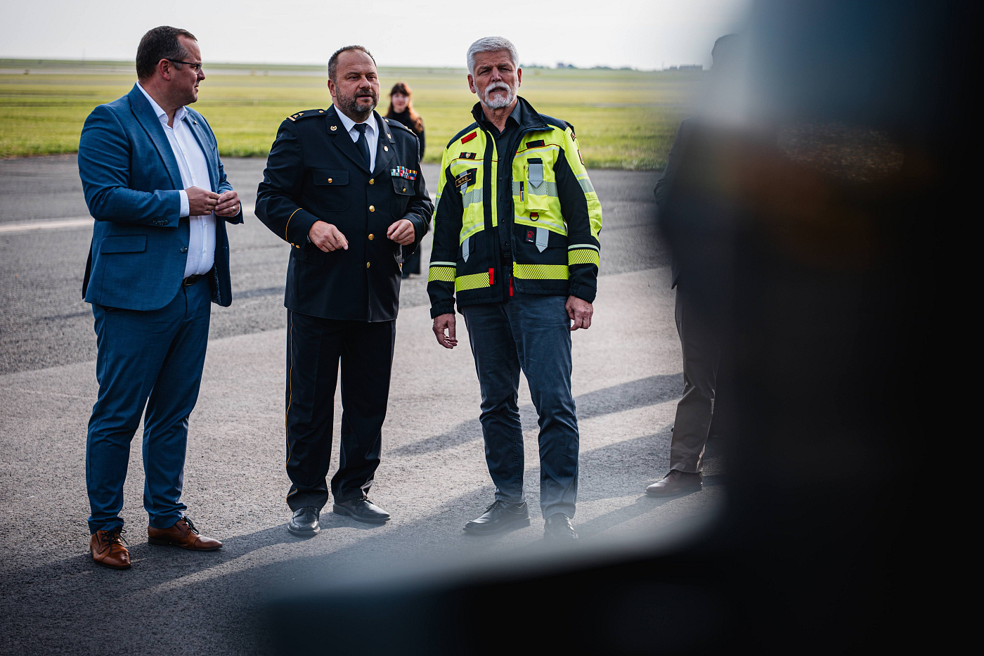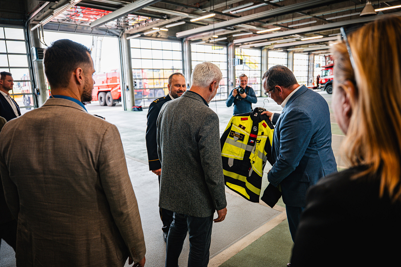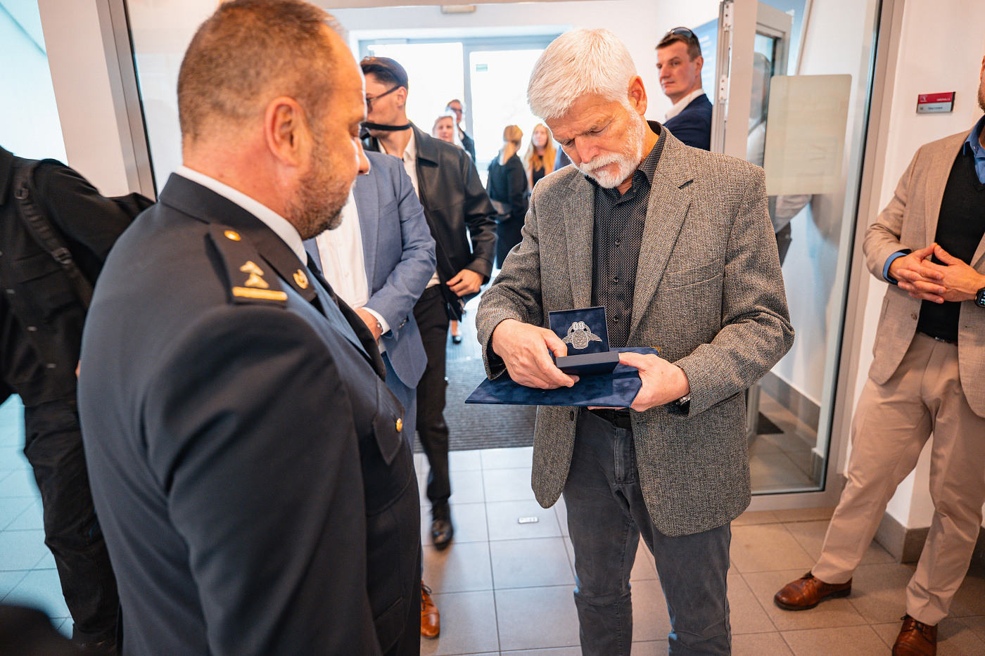 Prezidenta přivítal ředitel letištních hasičů Pavel Hošek, který mu předal pamětní plaketu k osmdesátému výročí založení jednotky. Jako další symbolický dar obdržel Petr Pavel speciálně ušitý zásahový kabát od české firmy GoodPro, která se specializuje na výrobu ochranných oděvů pro záchranné složky.
