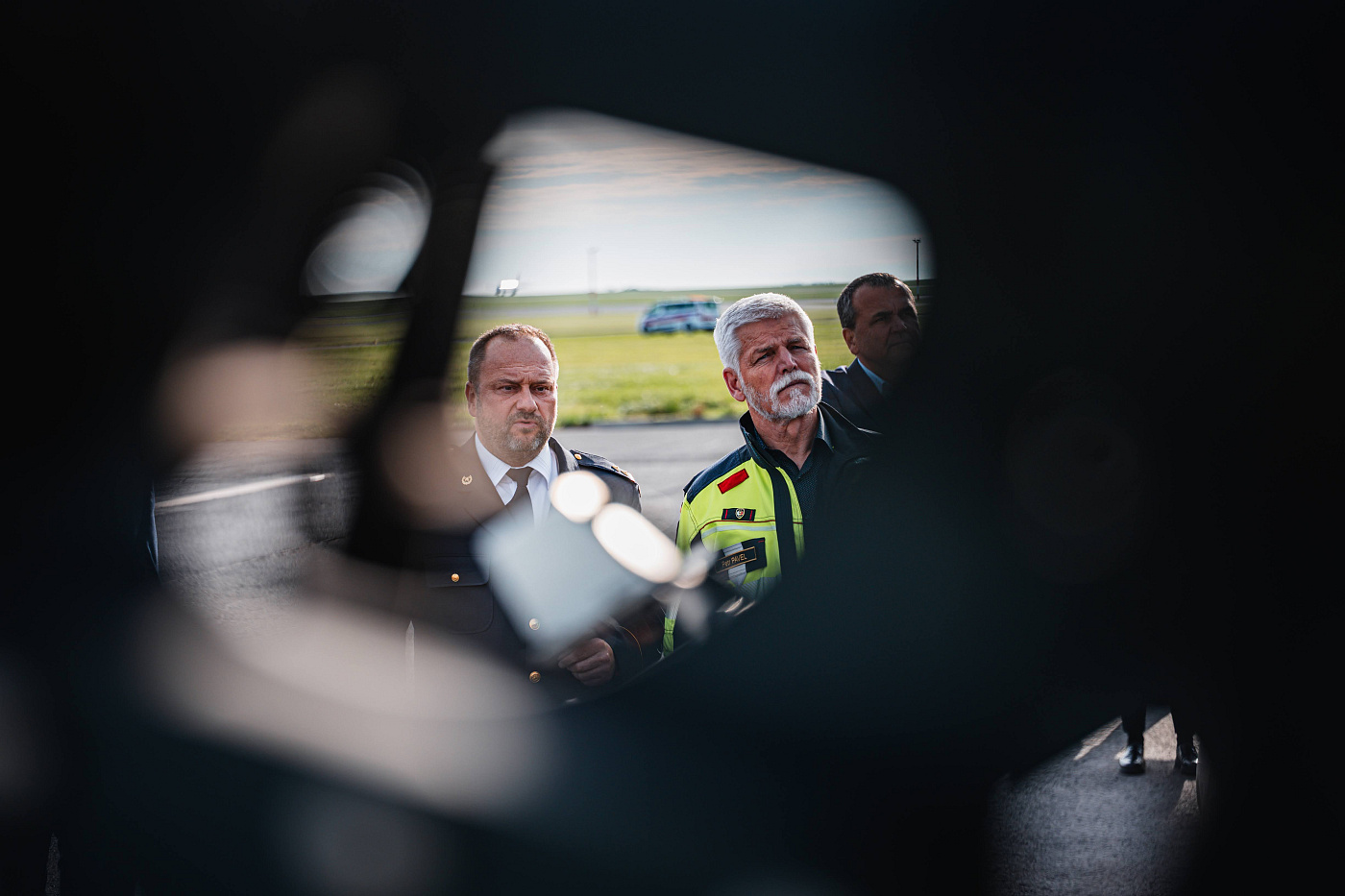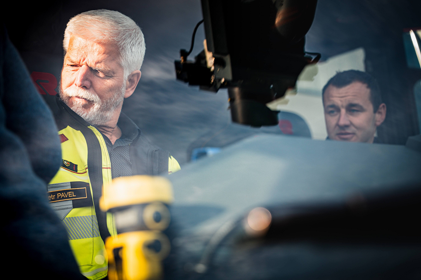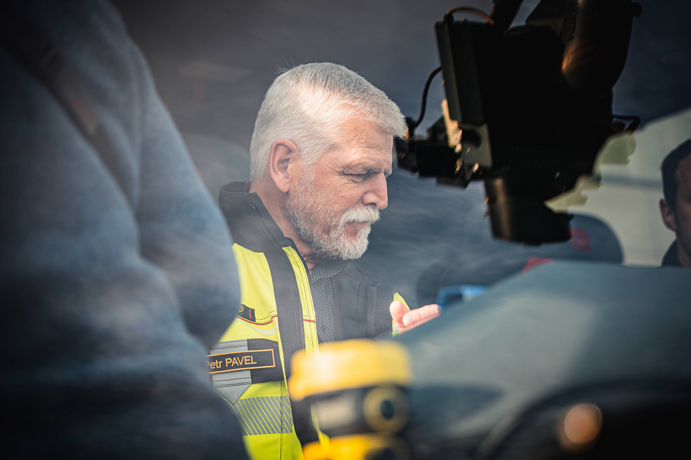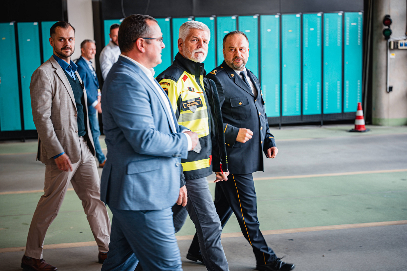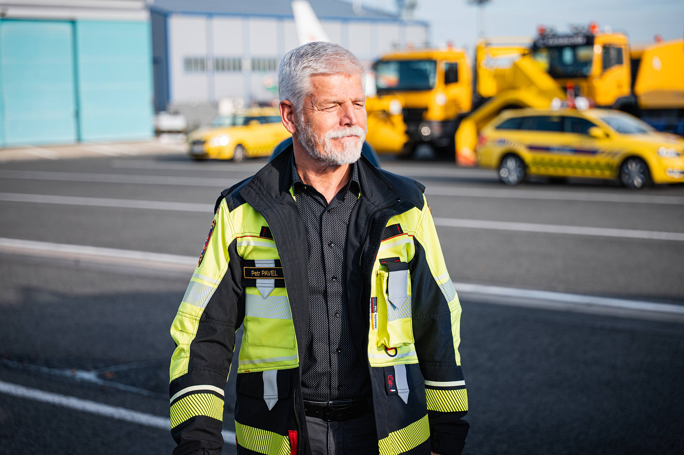 Prezident Petr Pavel navštívil letištní hasiče v Praze. Dostal zásahový oblek a svezl se Pantherem