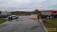 Na odbočce k Brodu nad Tichou se střetlo nákladní a dvě osobní auta. Pět osob skončilo v péči záchranné služby. Hasiči likvidují únik provozních hmot.