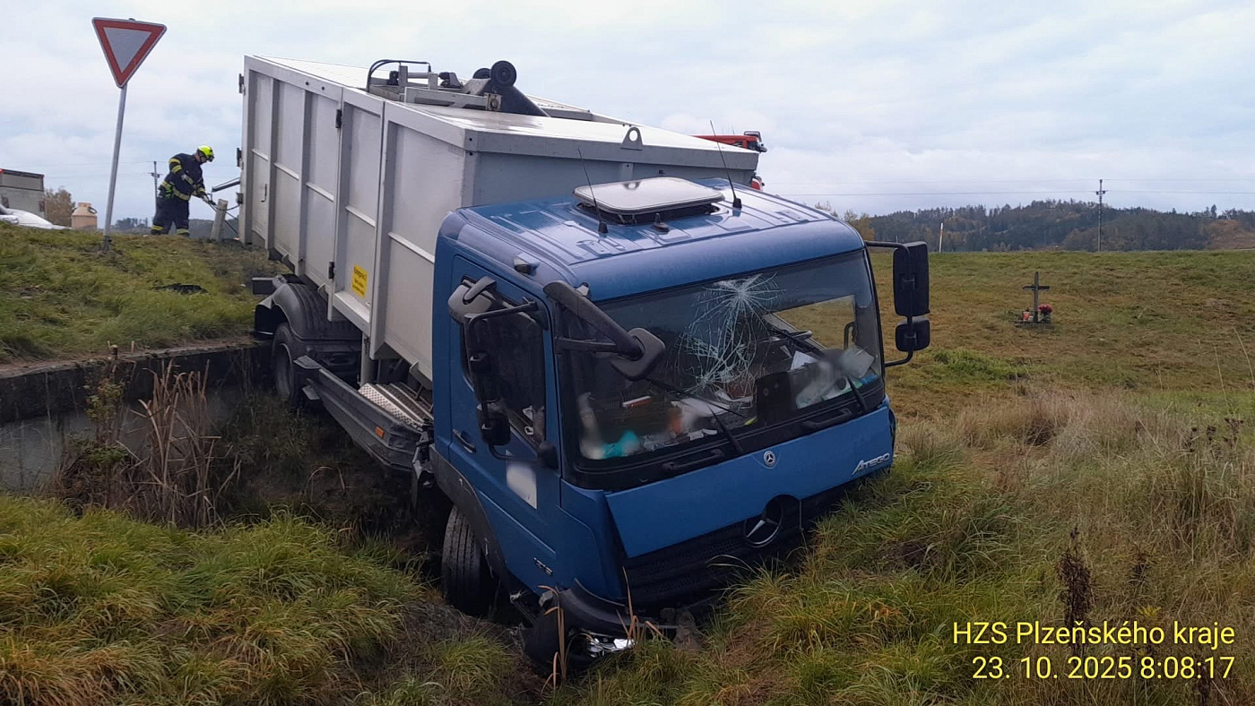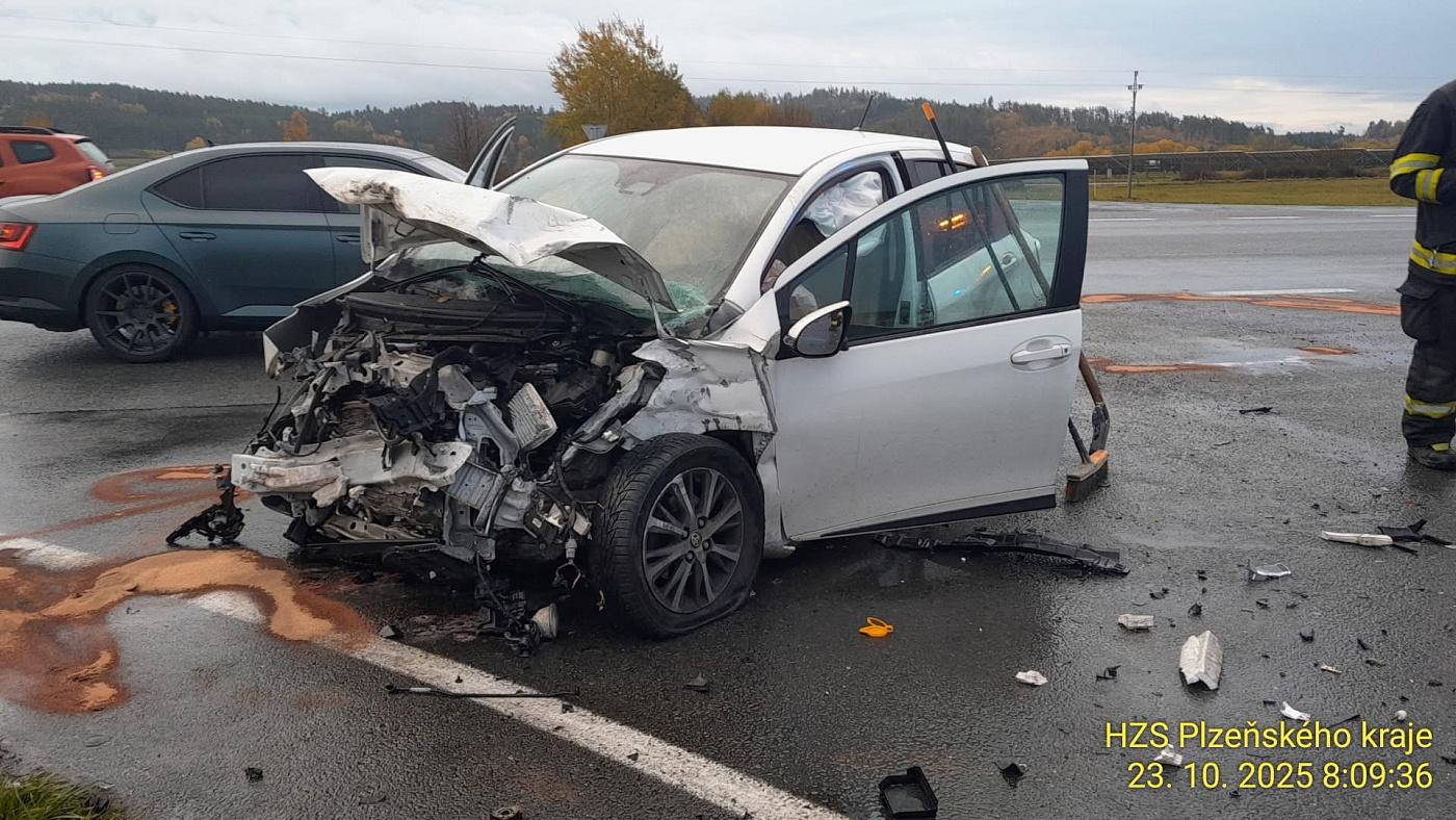 Na odbočce k Brodu nad Tichou se střetlo nákladní a dvě osobní auta. Pět osob skončilo v péči záchranné služby. Hasiči likvidují únik provozních hmot.