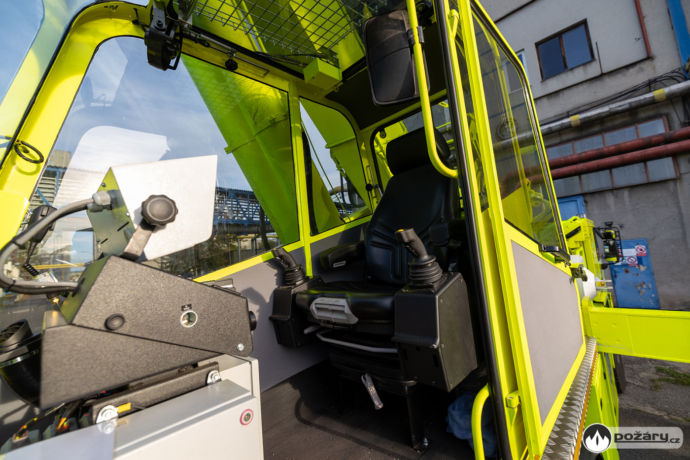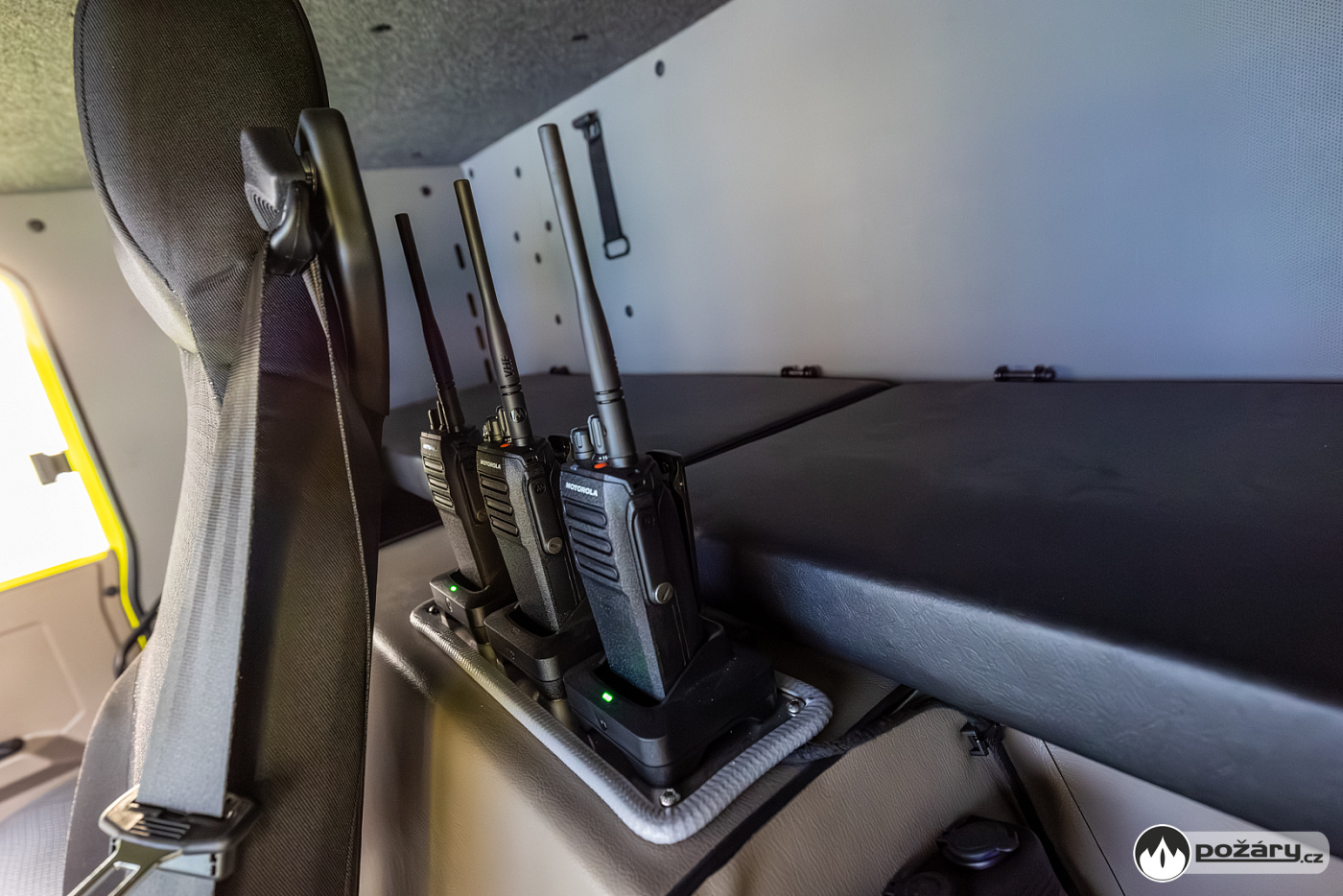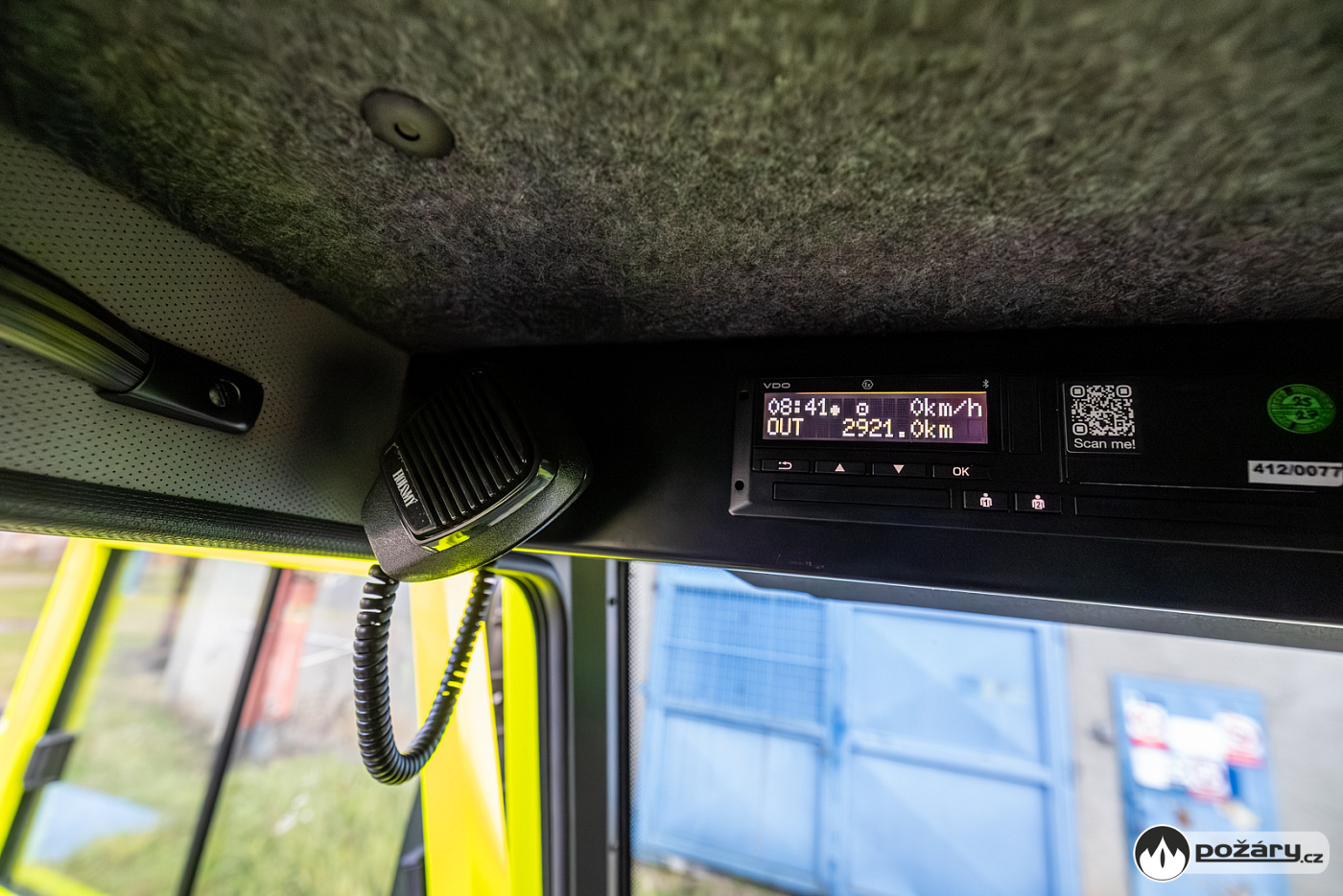 Kabina je dvoudveřová, třímístná, za prostředním sedadlem najdeme trojici ručních radiostanic v dobíjecích úchytech.