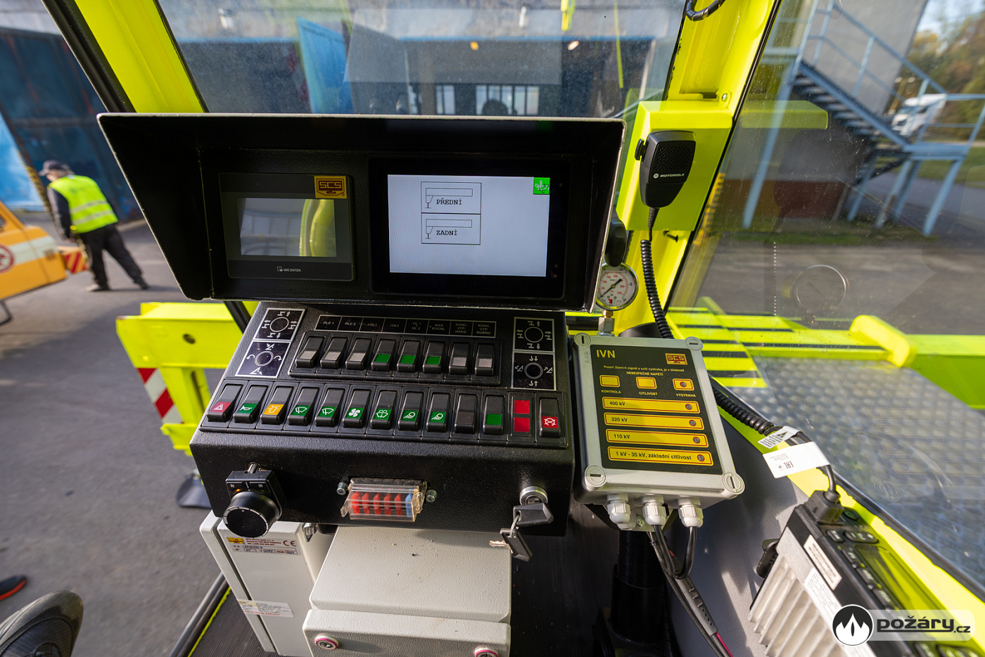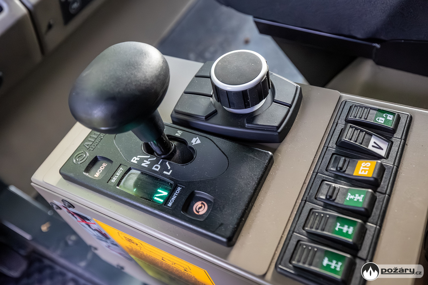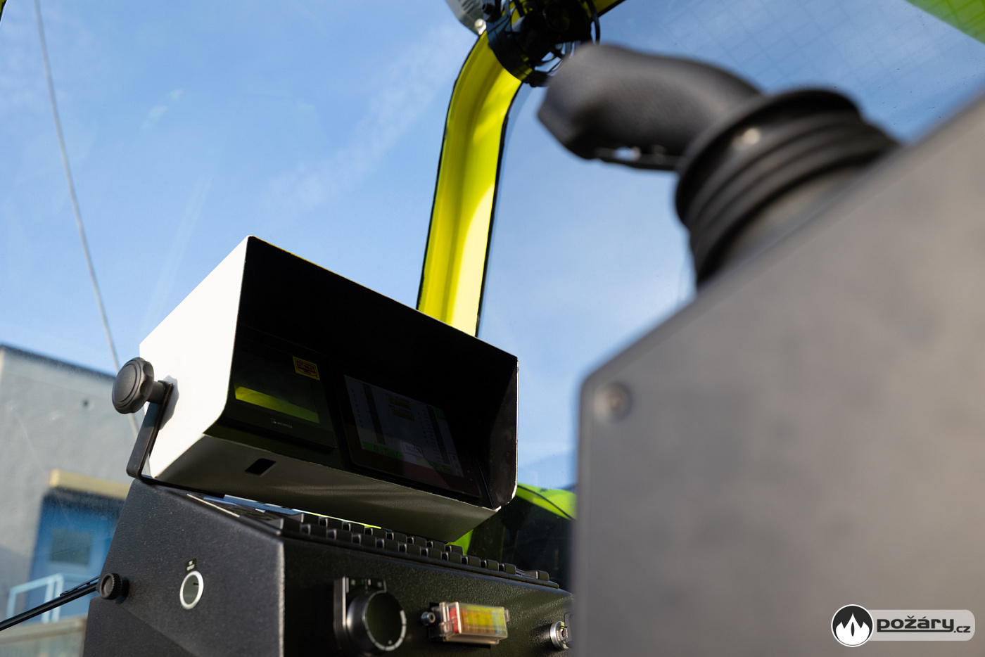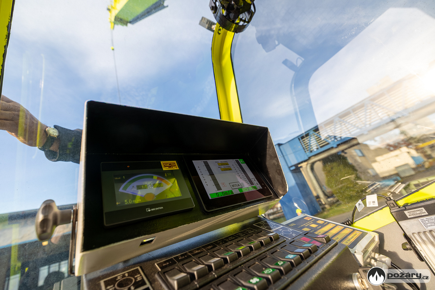 Kabina je dvoudveřová, třímístná, za prostředním sedadlem najdeme trojici ručních radiostanic v dobíjecích úchytech.