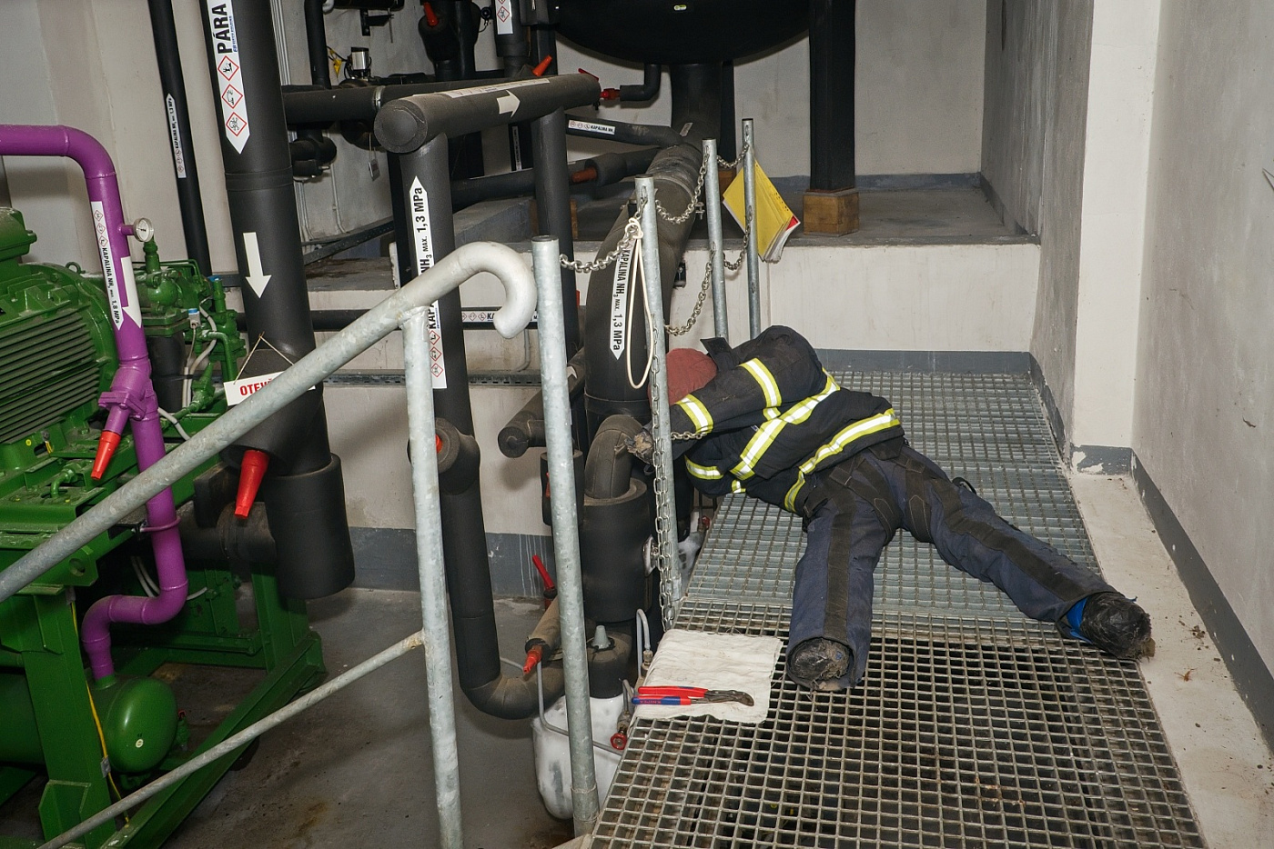 Na prvním úseku se jednotky zaměřily na likvidaci úniku čpavku ve strojovně chlazení, kde byly naměřeny vysoké koncentrace nebezpečné látky. V blízkosti stadionu vzniklo dekontaminační stanoviště se sprchou a nástupním prostorem. Po vystrojení hasičů do protichemických obleků a zřízení jisticí skupiny byl v prostoru strojovny nalezen zraněný pracovník, který nejevil známky života. Po provedení dekontaminace lékař potvrdil jeho úmrtí. K omezení šíření čpavkových par byly v okolí strojovny zřízeny skrápěcí deflektory.