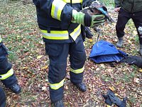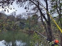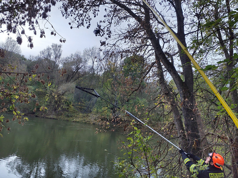 Na stromě ve výšce asi sedm metrů uvízla sojka, která se zamotala do pletiva. Pomocí rybářského podběráku se hasičům podařilo ptáka bezpečně vyprostit. Zachráněnou sojku poté umístili do rybářského boxu.