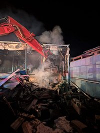 Ve 3:06 hodin se začala rozebírat konstrukce haly pomocí speciální techniky. Hasiči zároveň dohašovali skrytá ohniska. Na místo byl přivolán statik, který posoudil stav objektu a rozhoduje o dalším postupu, včetně možnosti stržení haly z důvodu narušené statiky.