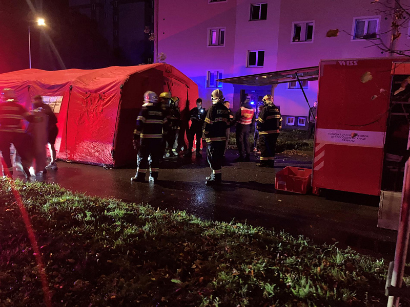 Noční požár bytovky v Příbrami způsobilo nabíjení elektrokoloběžky, pro evakuované hasiči stavěli stan